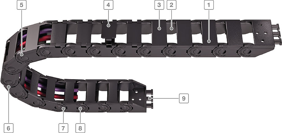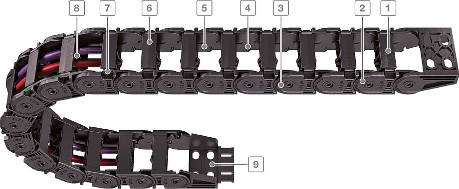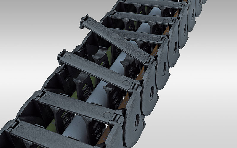 打開式塑料拖鏈每節都能打開,裝拆方便,不必穿線,打開蓋板后即可把電纜、油管、氣管等放入拖鏈內。